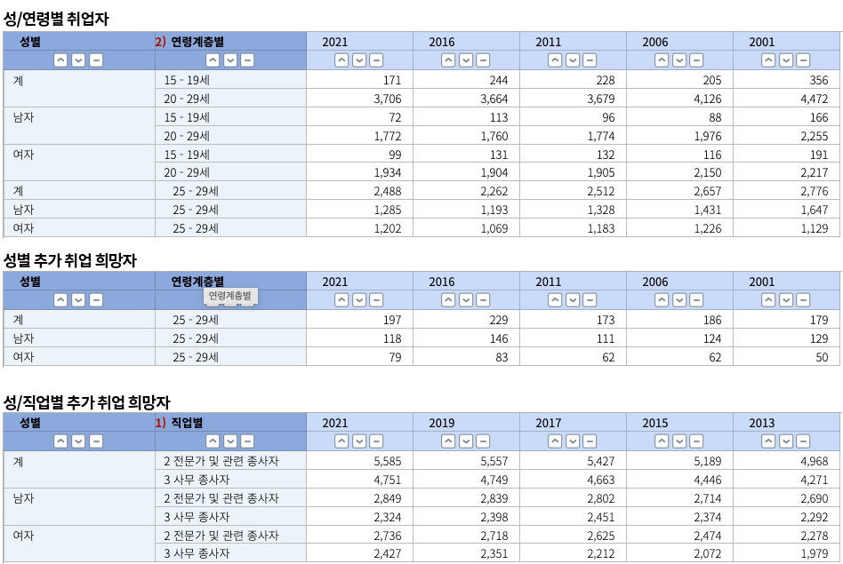 자료를 보자. 20대 취업자 수는 2001년 이후 남성보다 여성 취업자 수가 더 많아졌다. 그 간격은 시간이 지날수록 더 벌어지고 있다. 문제는 20대 남성이 군대를 다녀온 시점인 20대 후반이다. 아직까지 남성 취업자 수가 더 많지만, 여성과 차이가 점차 줄어든다. 20대 추가 취업 희망자 수 역시 간극이 줄어들고 있음이 확실하다. 20대가 가장 선호하는 직종인 '전문가나 사무 종사자' 직군 경우 성별 간 차이를 느끼기 어렵다. 오히려 사무 종사자 직군은 2021년부터 여성이 남성보다 더 많은 사무실 책상을 차지한 것으로 조사됐다.