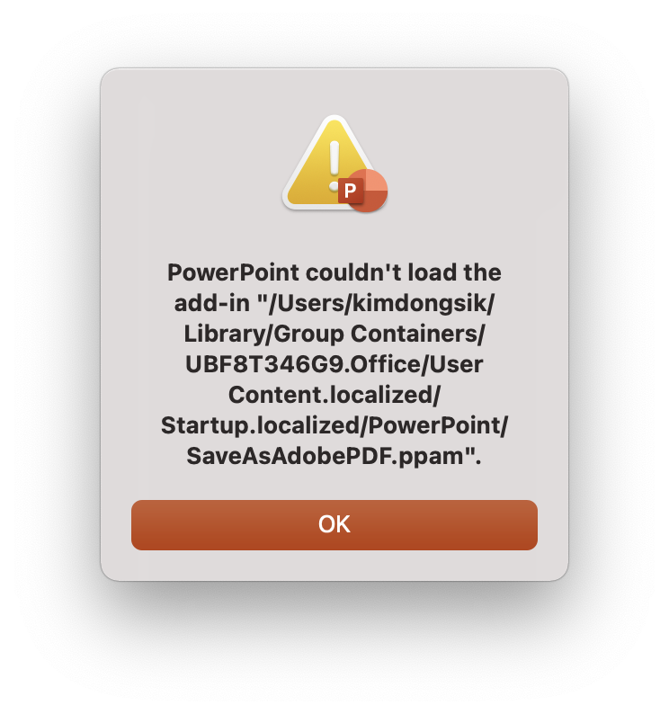 ~/Library/Group Containers/UBF8T346G9.Office/User Content .localized/Startup.localized/에 있는 Word, Excel, PowerPoint 폴더에서 linkCreation.dotm와 SaveAsAdobePDF.ppam를 찾아서 삭제하세요.