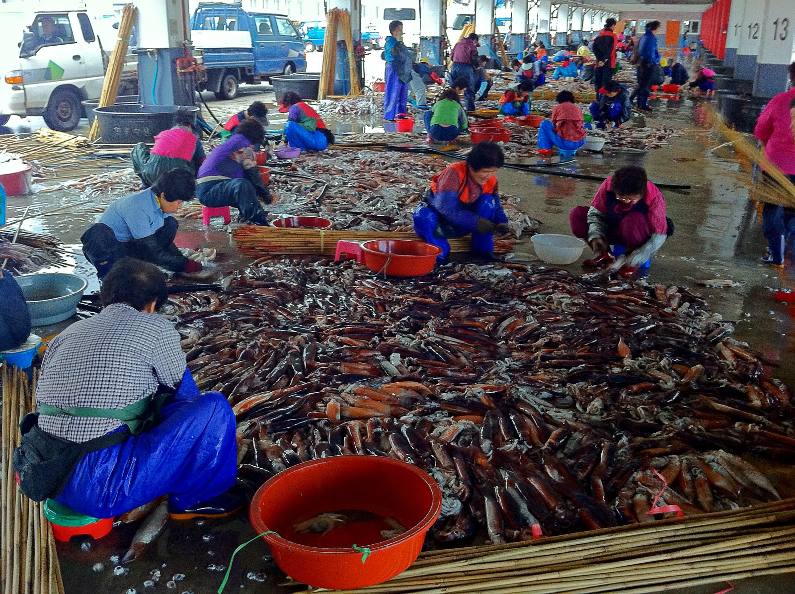 기후변화의 여파로 오징어 어획이 많이 줄었지만, 울릉도 어업 전진기지 저동항을 새벽녘에 가보는 것을 추천한다. 저동항 새벽 어판장에서는 오징어, 병어, 전복과 같은 싱싱한 횟감을 싼 가격에 구입할 수 있으며, 오징어 경매 구경도 재미가 쏠쏠하다. 더불어 울릉도에서만 볼 수 있는 단체 오징어 손질 풍경도 함께 감상할 수 있다.