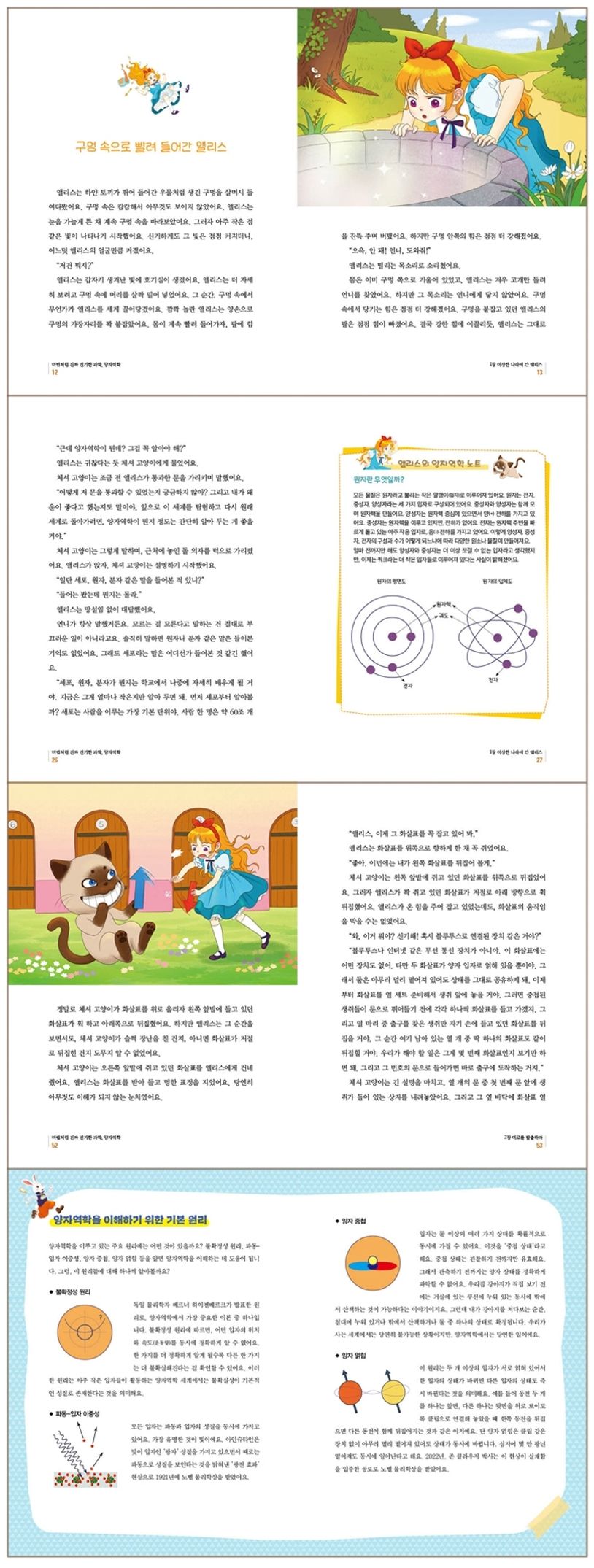 앨리스는 하얀 토끼를 따라가다 우물처럼 생긴 구멍 속으로 떨어집니다. 그런데 그곳은 신비로운 양자역학 세계였지요. 앨리스는 그곳에서 체셔 고양이를 만나 터널링 효과로 벽을 통과하고, 전자 병사들과 마주치며 미시 세계의 규칙을 하나씩 배웁니다. 하지만 원래 세상으로 돌아갈 방법을 찾기 위해 원자핵 여왕을 만나러 갔다가, 외부에서 온 존재라는 이유로 진공 감옥에 끌려갈 위기에 처하고 맙니다. 과연 앨리스는 양자역학 세계에서 탈출해 무사히 집으로 돌아갈 수 있을까요?