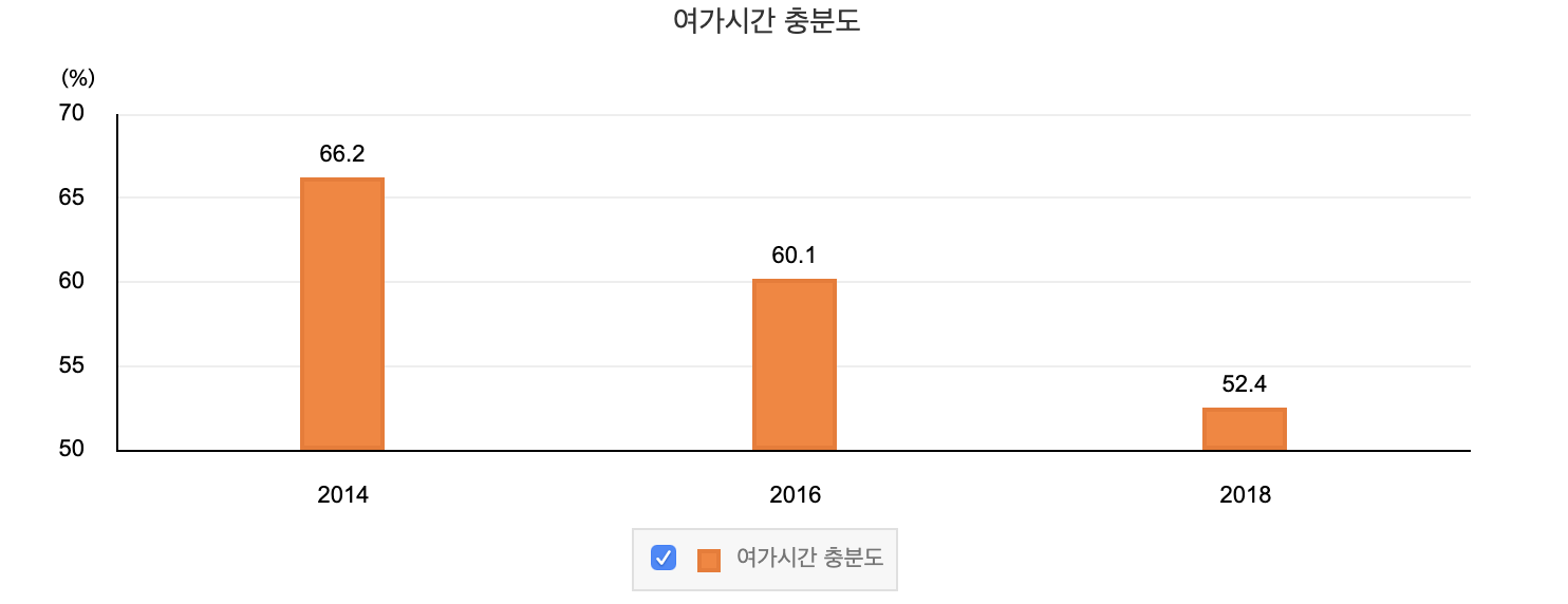한 가지 지표를 더 보자. 위 그래프는 여가시간이 충분하다고 느끼는 사람에 대한 조사 결과다. 2014년 66.2%에서 52.4%로 줄었다. 일하는 시간이 더 늘어난 걸까? 임금근로자의 월간 근로시간은 2006년 193.4시간에서 2018년 156.4시간으로 조금씩이지만 분명히 줄어들고 있다. 156.4시간은 2006년 이후 최저 근로시간이다. 그런데 어째서 여가시간은 더 부족할까? 이러한 통계 지표를 봤을 때 현 세대는 이전 세대보다 자기 자신의 여가시간과 삶을 더 중요시하고 있다는 것을 알 수 있다.
