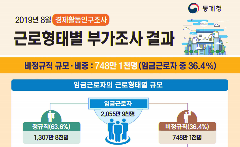 '2019년 8월 경제활동인구조사 근로형태별 부가조사 결과'에 따르면 올해 8월 기준 비정규직 근로자 수는 748만 1천 명으로 집계됐다. 전체 임금근로자 2천55만 9천 명 가운데 비정규직이 차지하는 비중은 36.4%였다. 방송에서 예를 들은 작년 연말 집계는 아직 찾지 못했지만 작년 상반기 기준 남자 44.9%, 여자 55.1%다. 약 10%의 차이가 있다고 하지만 조선시대에 비할 바는 아닌 것 같다. 점점 나아지고 있다고 볼 수 없나?