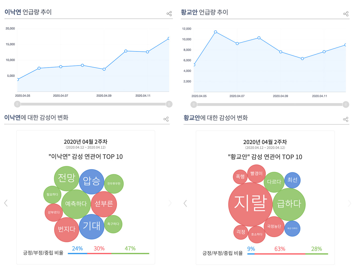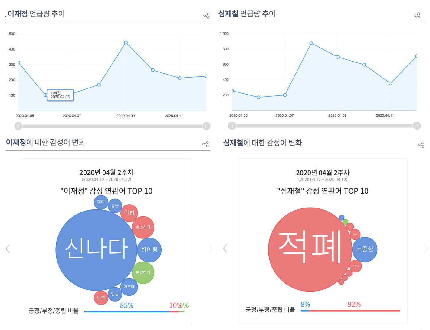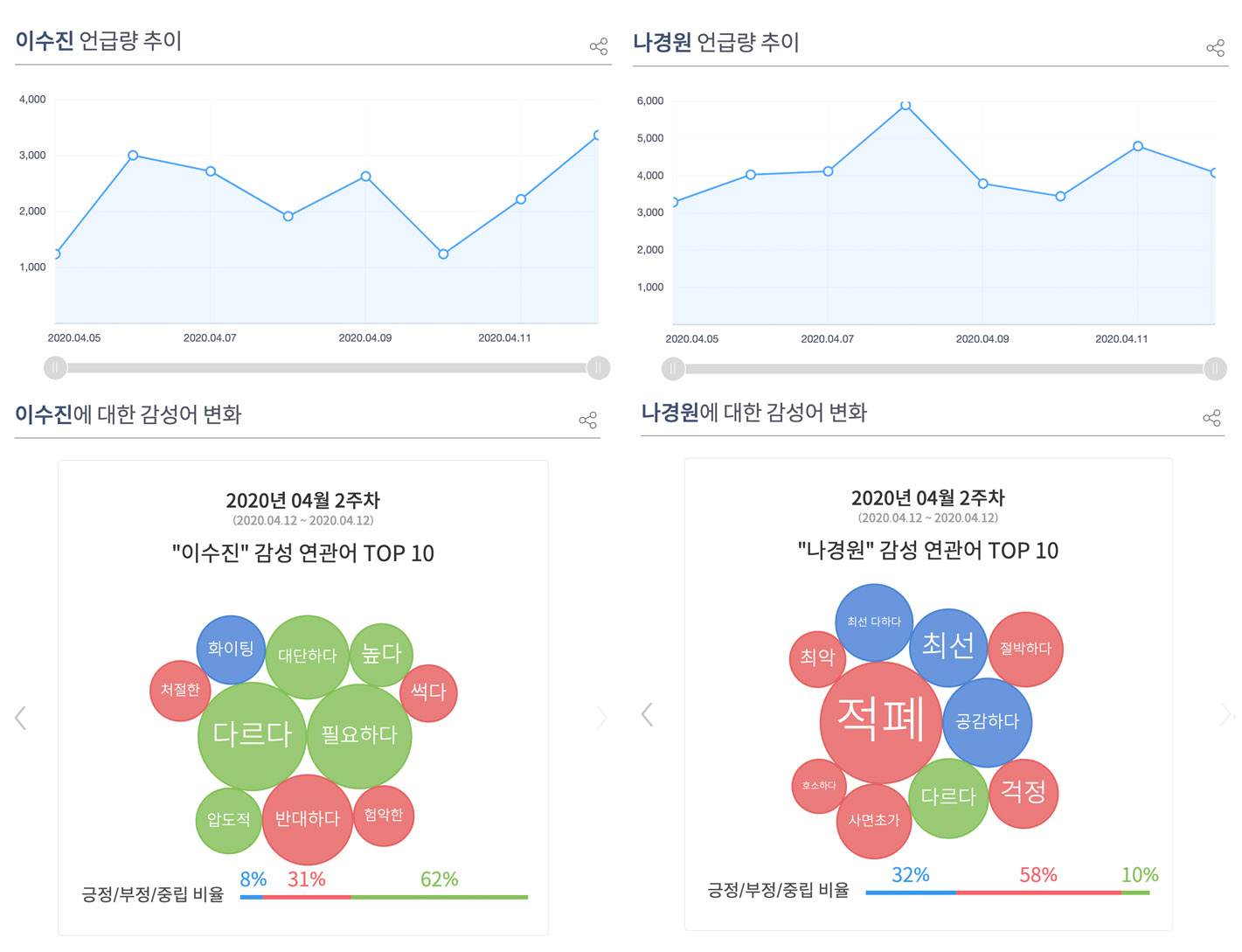 검색량으로 따지면 당연 나경원 후보가 앞서고 있습니다. 다만 부정적 비율이 압도적이라 이 부분은 변수일 수 있을 것 같습니다. 그래도 이수진 후보에겐 힘든 싸움이 될 것 같네요.
