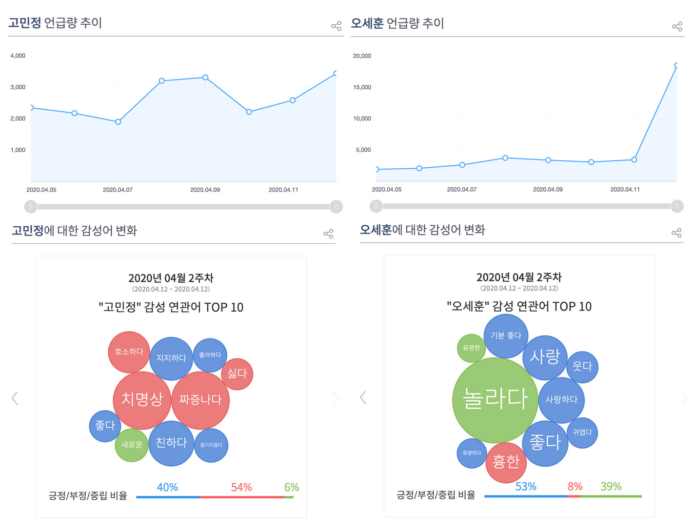 박근혜가 증명했던 사실이 계속 이어져 옵니다. 역시 선거에 칼빵만큼 좋은 전략은 없네요. 이쯤 되면 황교안이 먼저 수를 쓰지 않았던 것을 후회할 듯합니다. 오세훈 후보, 급격하게 상승한 검색량과 긍정, 부정, 중립 비율을 보세요. 고미정 후보는 칼침 한 방에 무너진 또 하나의 후보가 될 수 있을지도 모르겠습니다. 이 동네가 여론조사 내용과 결과를 비교하기 가장 좋을 것 같습니다. 개인적으로 고민정 후보 출마가 달갑지 않았는데...
