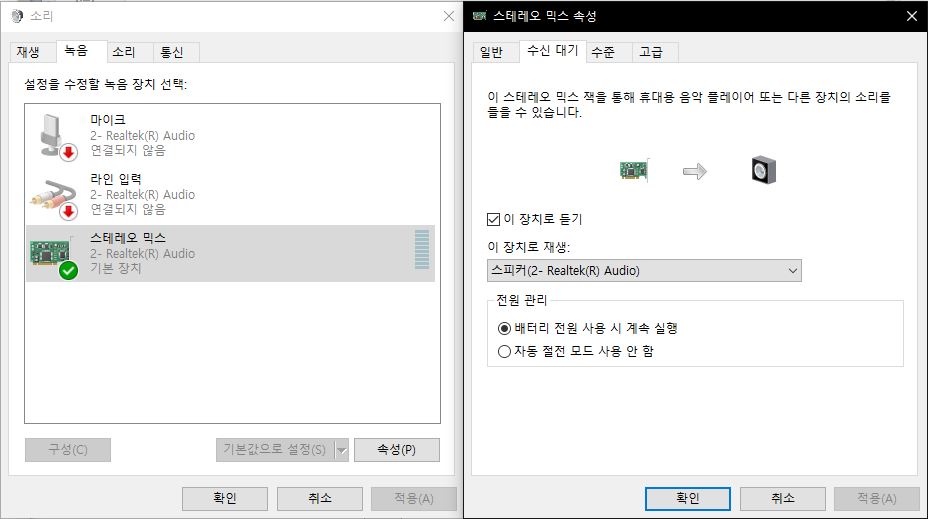 그러면 소리 설정창이 열리는데 여기서 녹음 탭에 가서 스테레오 믹스를 설정하고 속성(P)을 선택하고 스테레오 믹스 속성이 나오면 수신대기 창의 '이 장치로 듣기'를 선택해 준다. 이러면 Windows 상의 소리를 전부 녹음할 수 있게 된다. 유튜브 영상의 음성만 따로 녹음하려고 할 때도 이렇게 설정한 후 영상을 틀고 녹음기 등을 이용해 녹음하면 된다.