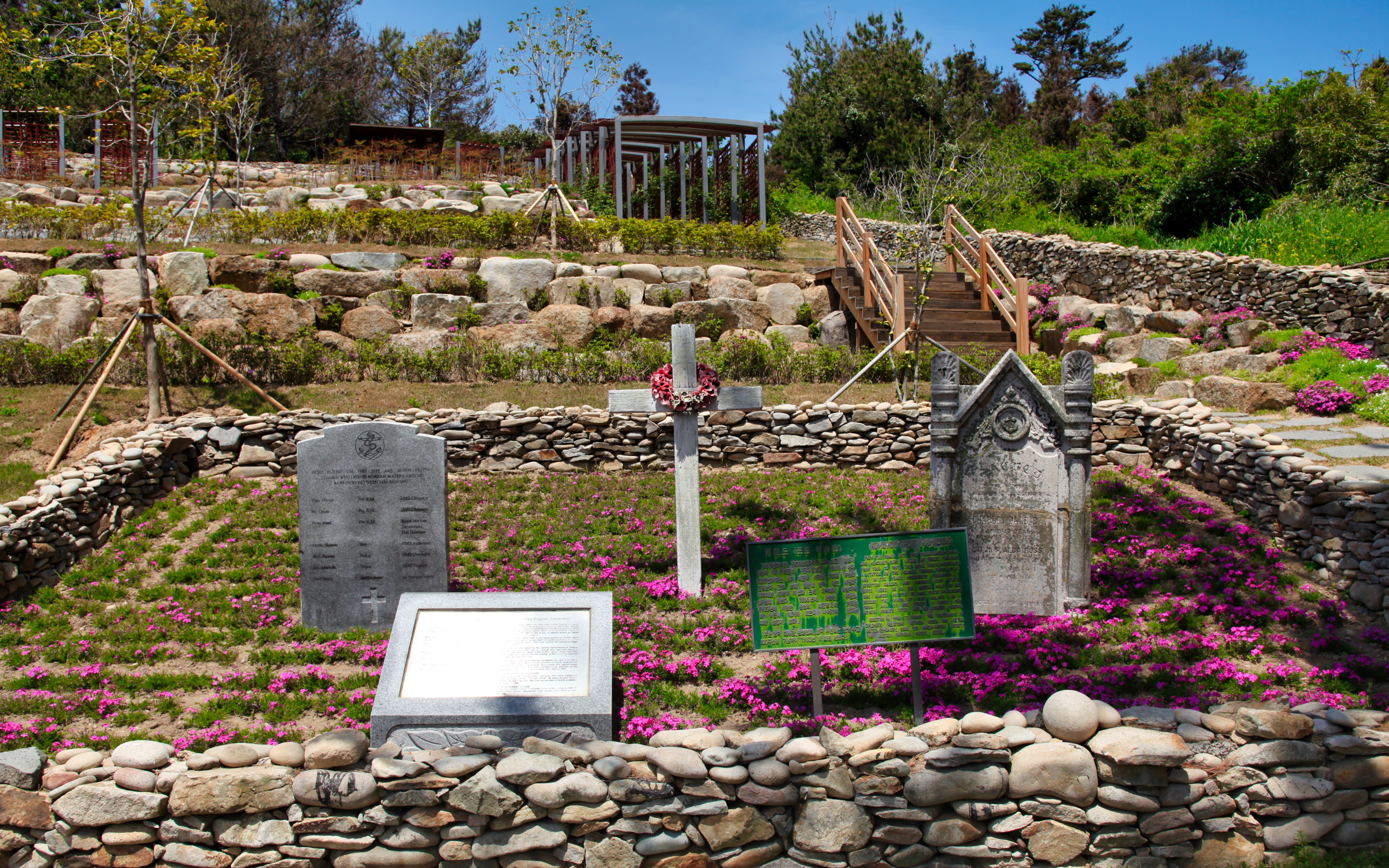 고도에 있는 거문도 역사공원에는 영국군 묘지가 있다. 항구에서 30분 남짓, 동백꽃과 유채꽃 피어있는 아기자기한 길과 돌계단을 감상하며 걷다보면 어렵지 않게 도달할 수 있다. 공원에 도착하면 묘비와 나무 십자가가 맞이하는데 이 화강암 묘지는 1886년 거문도 점령 중에 탄약사고로 사망한 2명의 군인을 위해 세운 묘지라고 한다. 100년이 넘는 세월을 고스란히 담고 있는 듯, 글씨를 알아보기 힘들 정도로 깎여 있어 또 다른 풍미를 느끼게 한다. 영국군 묘지는 당시 치열했던 열강들의 세력다툼 속에 끼어서 영토를 점령당해야 했던 쓰라린 역사의 흔적이다.